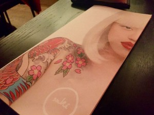 So we are moving on to the Sushi bar stop number two on our Sake safari! I wanted to stay here a while as the dishes all sounded so good and I remembered the oysters with fizzy grape from the opening – they were the bomb!! So choose from the following – I dare you!